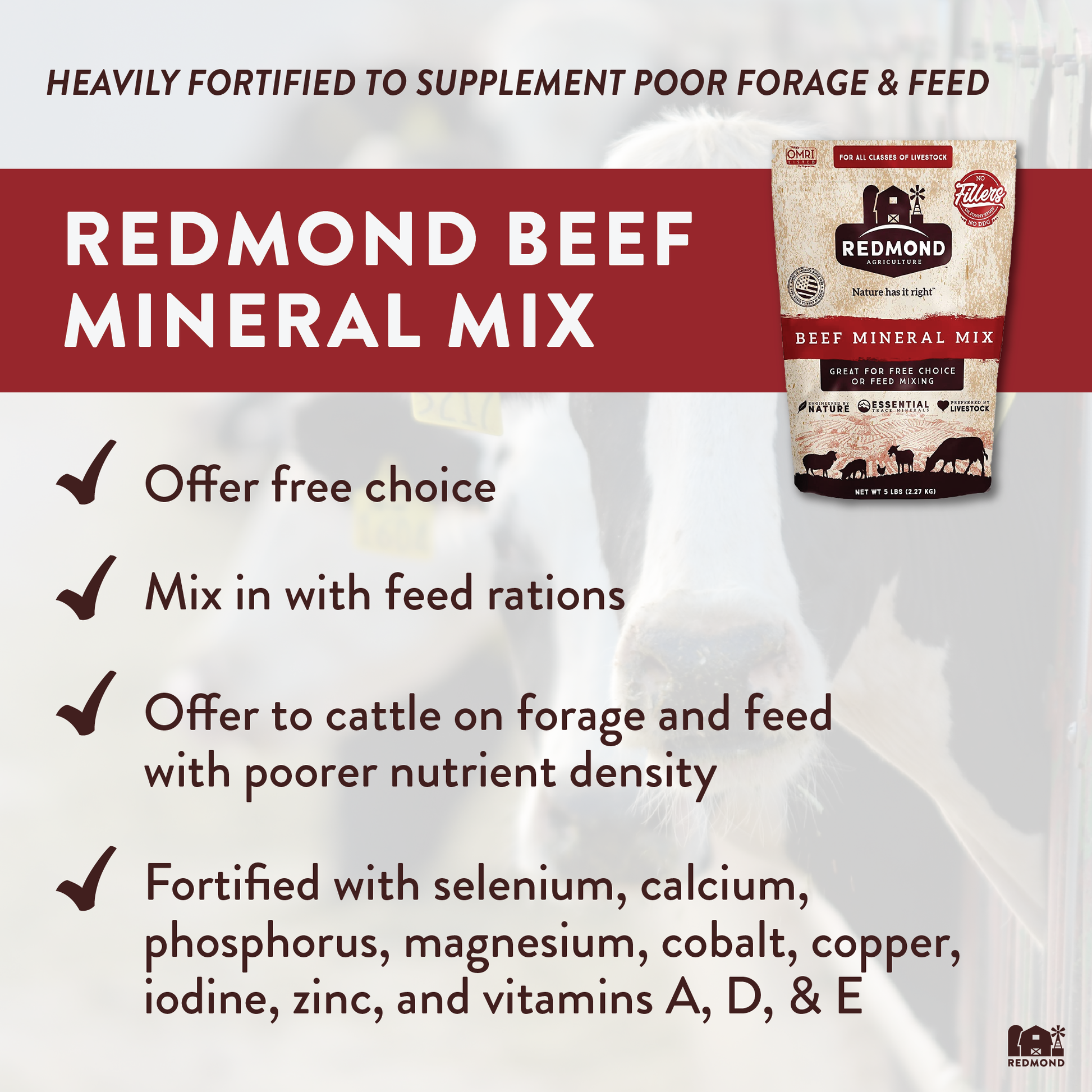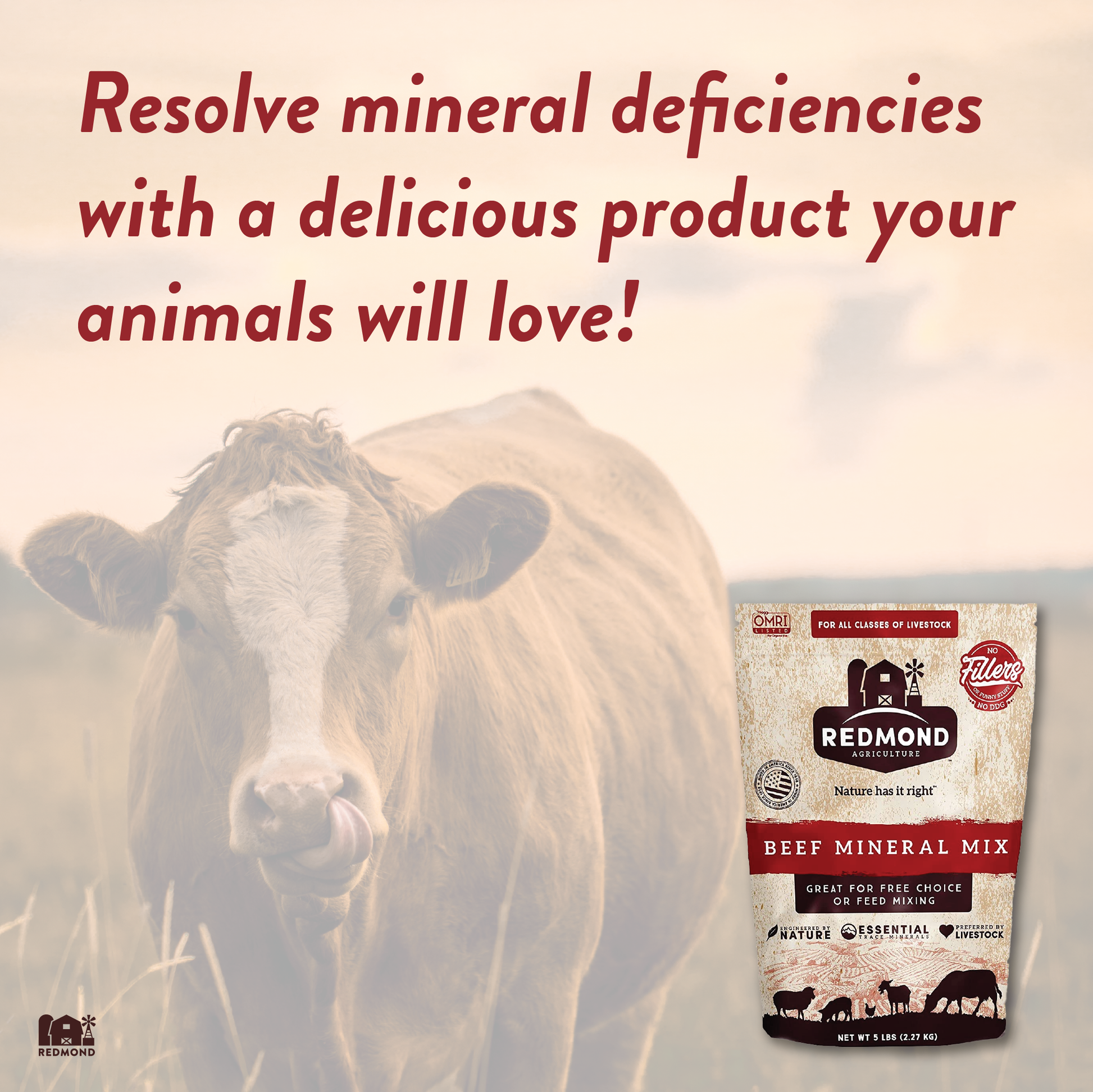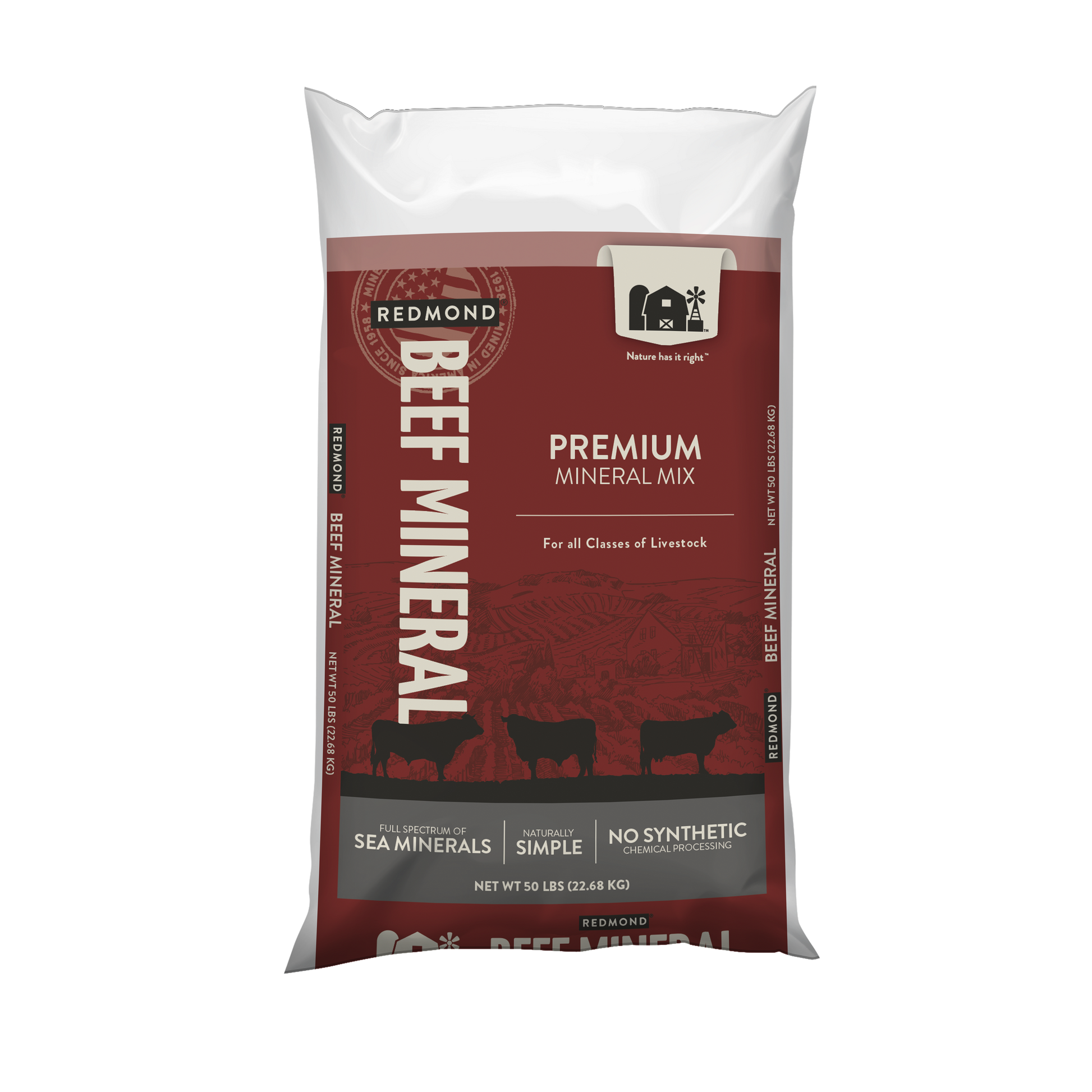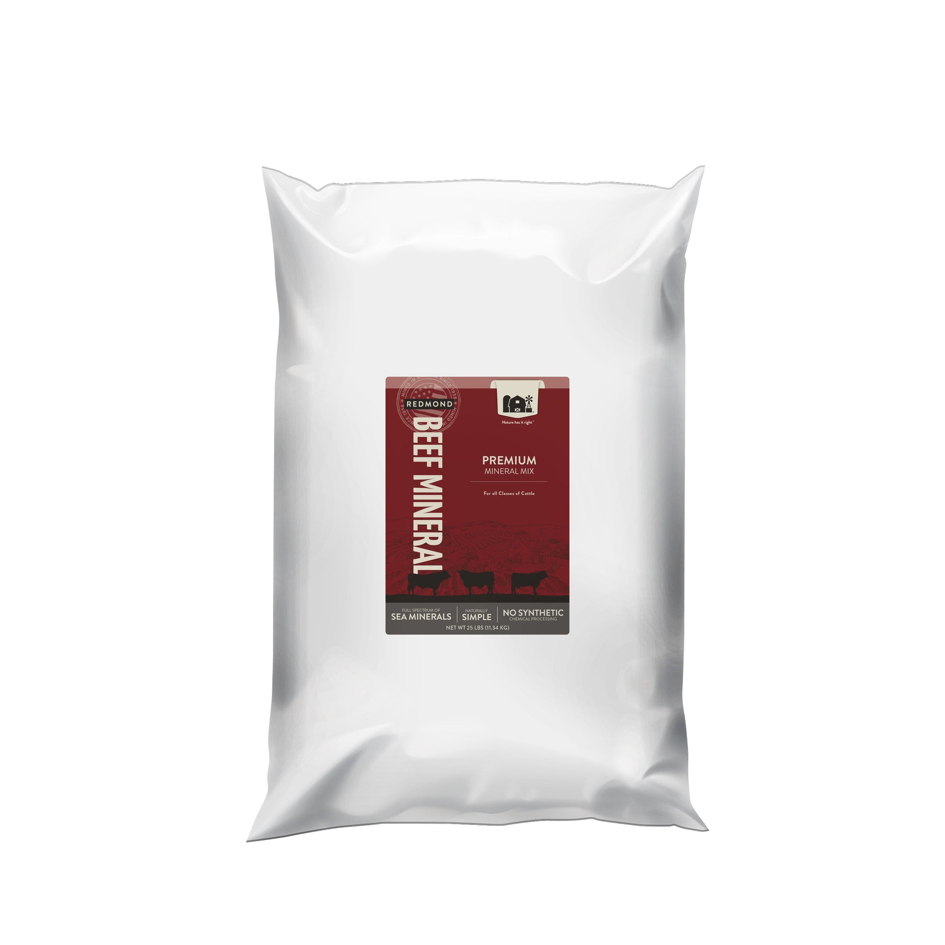 Redmond Beef Mineral is our foundational minerals with selenium, calcium, phosphorous, magnesium, cobalt, copper, iodine, zinc, and vitamins A, D and E added. If your animals are foraging in an area with a nutrient deficit, we highly recommend this product.